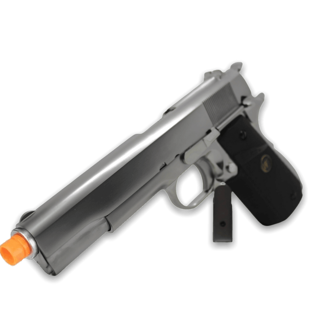 In a stainless finish, this 1911 Blowback Gel Blaster Pistol is one of the highest-quality blasters to come to Gelsoft!