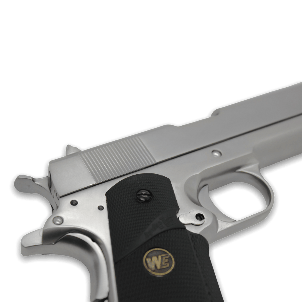 The WE Tech 1911 MEU Gelsoft Gas Blowback Pistol featured in this package comes in a matte chrome colour constructed out of stainless metal with classic-style polymer grips.